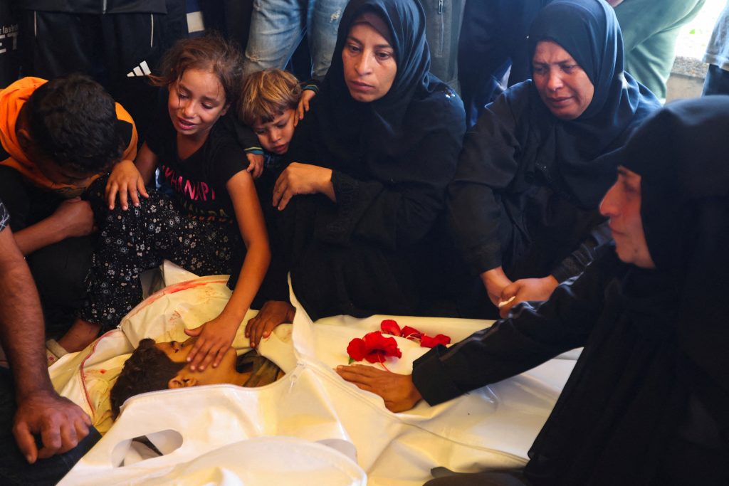 Mourners react next to a body as they attend the funeral of Palestinians killed in an Israeli strike on Saturday, according to medics, at Nasser Hospital in Khan Younis, southern Gaza Strip, October 5, 2025. REUTERS/Ramadan Abed