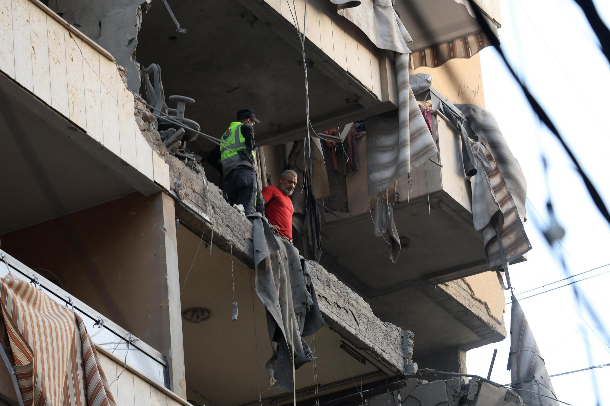 People inspect a damaged building after an Israeli military strike in Beirut’s southern suburbs, Lebanon on November 23, 2025. REUTERS/Mohamed Azakir