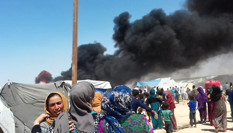 A Red Crescent center burns in al-Arishah Camp in Hasakeh | Image from SOHR