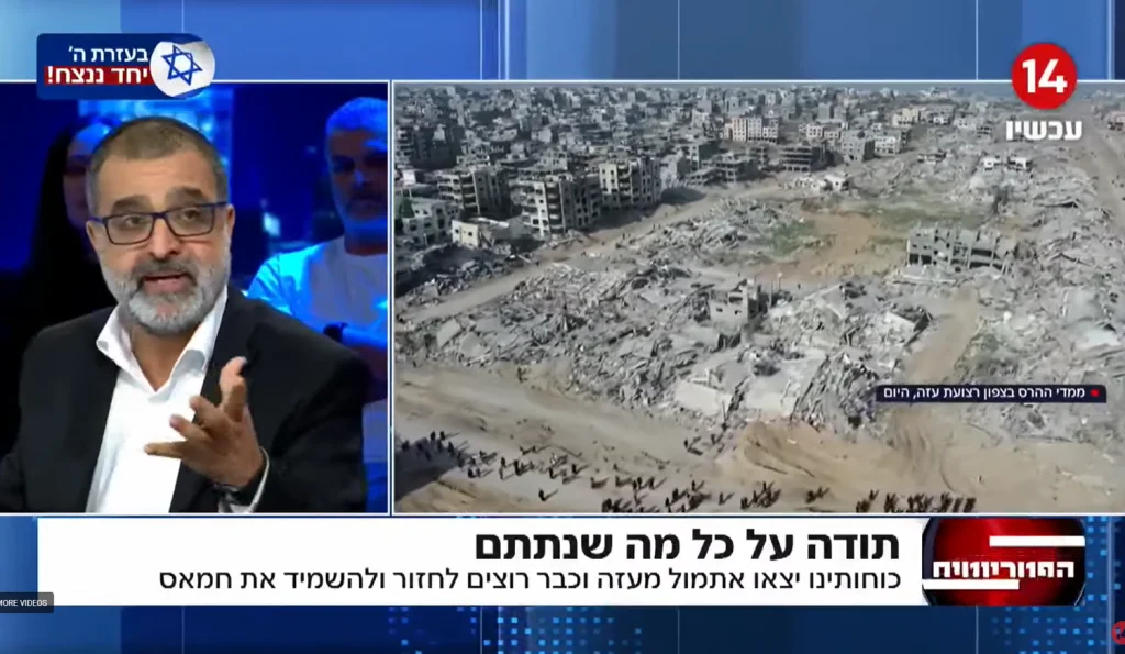 “You don’t understand what it’s like to knock down a seven-story building, six stories, five stories, one after another. Every house is on the edge,” Zarbiv told Channel 14. “Each week they’re taking 20 meters, 30 meters, 50 meters a week. There is no threat from the flanks, there is no threat from behind, because there are no flanks and no behind, just advancing forward, and everything is destroyed,” Zarbiv added.