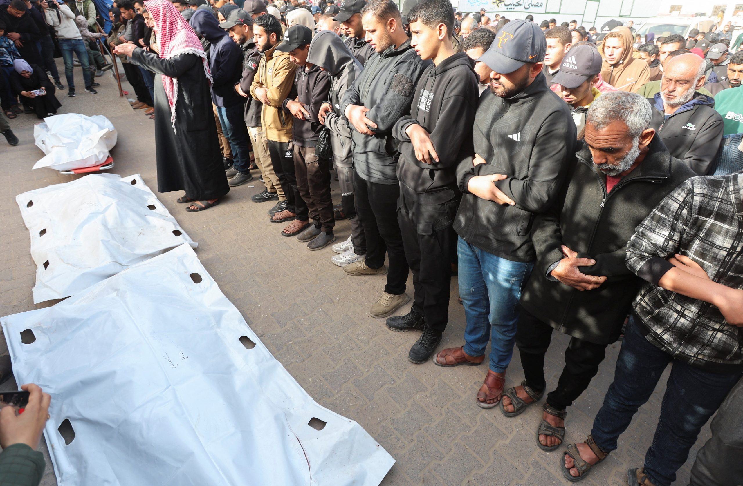Mourners pray during the funeral of Palestinians killed in an overnight Israeli strike, according to medics, at Nasser Hospital in Khan Younis in the southern Gaza Strip, February 15, 2026. REUTERS/Ramadan Abed