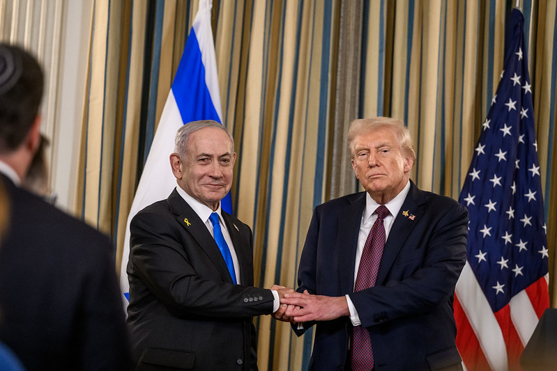 Trump and Netanyahu shake hands after a joint press conference on September 29, 2025, in the State Dining Room of the White House (White House photo)