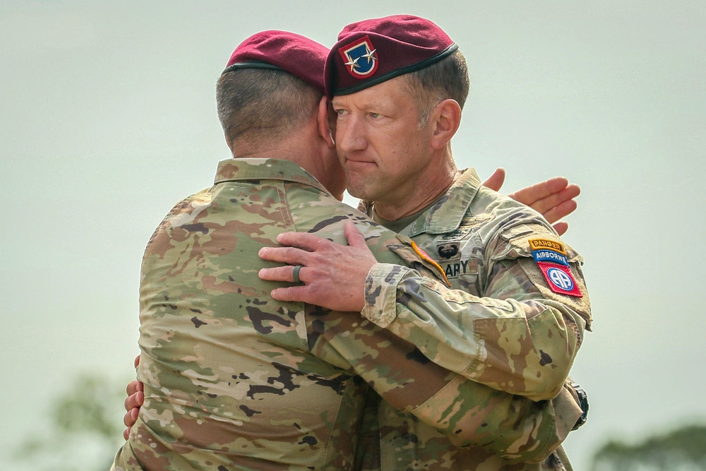 Maj. Gen. Brandon Tegtmeier, commanding general of the 82nd Airborne Division, receives a congratulatory hug by Lt. Gen. Gregory Anderson during a change of command ceremony on at Fort Bragg, North Carolina, August 28, 2025 (US Army photo)