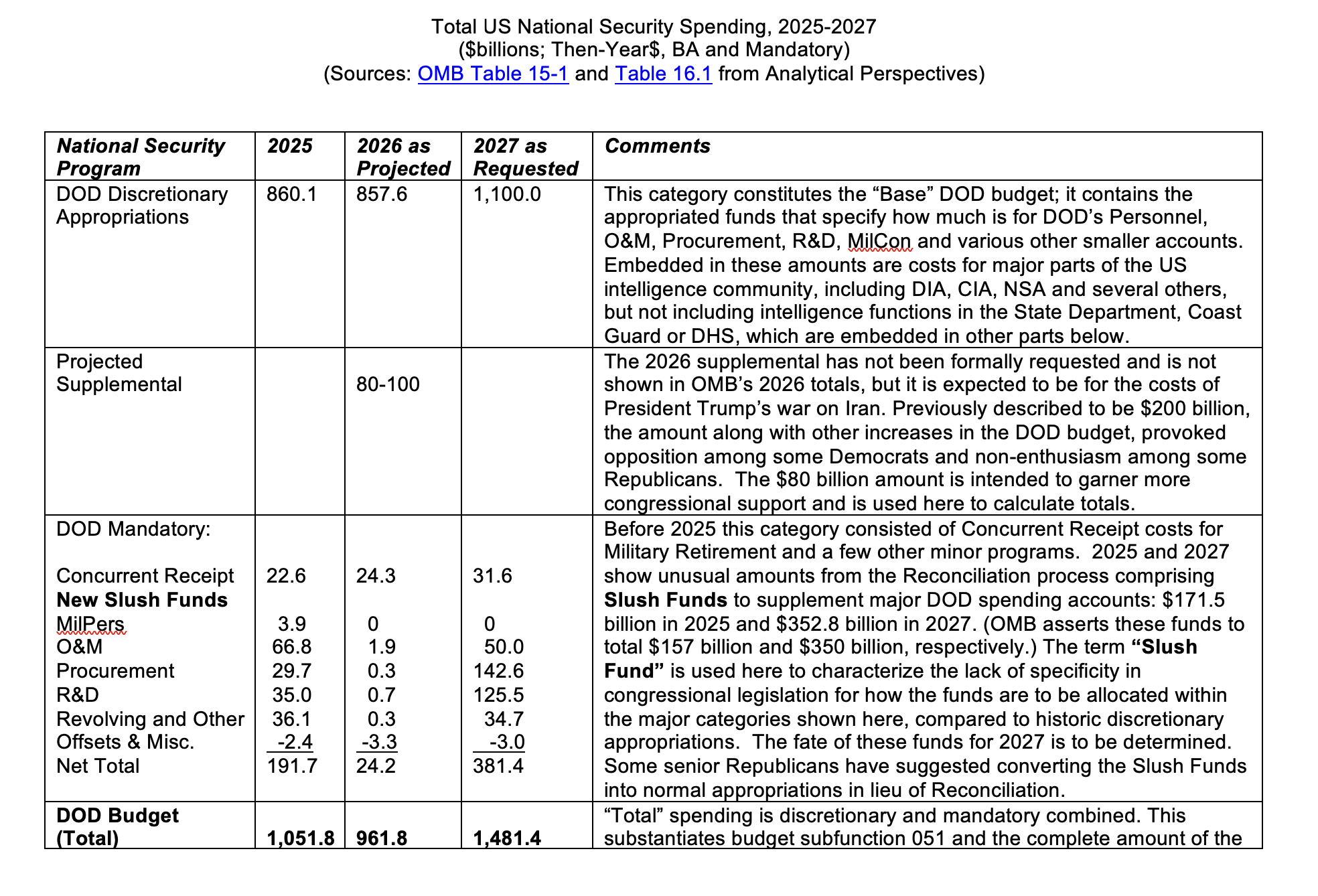 The White House’s Office of Management and Budget (OMB) has said that the $1.5 trillion military budget request for 2027 is a $445 billion, or 42%, increase over this year. The OMB said the $1.5 trillion includes $1.1 trillion in “base discretionary budget authority” for the Pentagon, plus a request for $350 billion in “additional mandatory resources through reconciliation.”