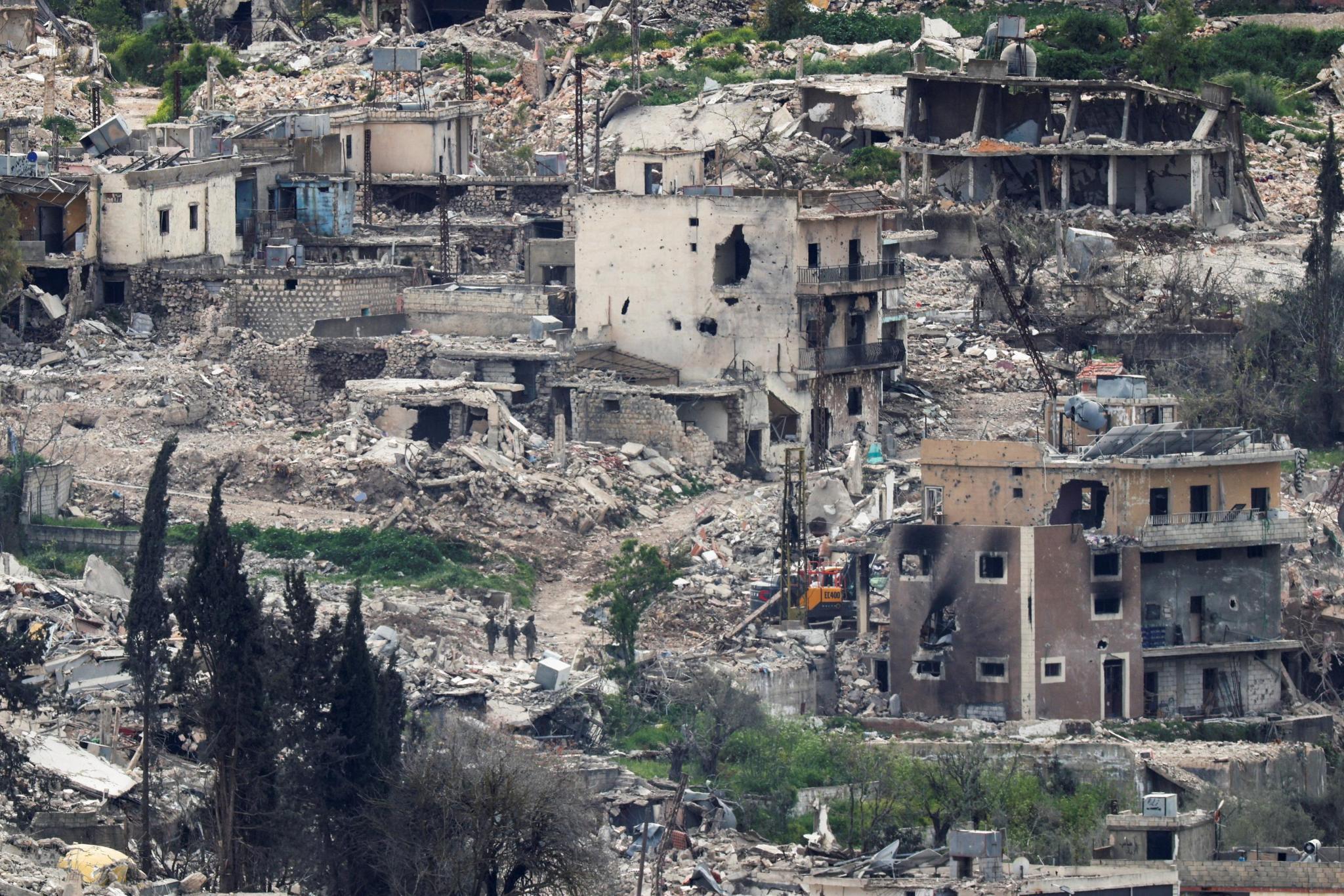 Israeli soldiers stand among destroyed buildings in southern Lebanon, near the Israel-Lebanon border, as seen from the Israeli side of the border in northern Israel, April 14, 2026. REUTERS/Florion Goga