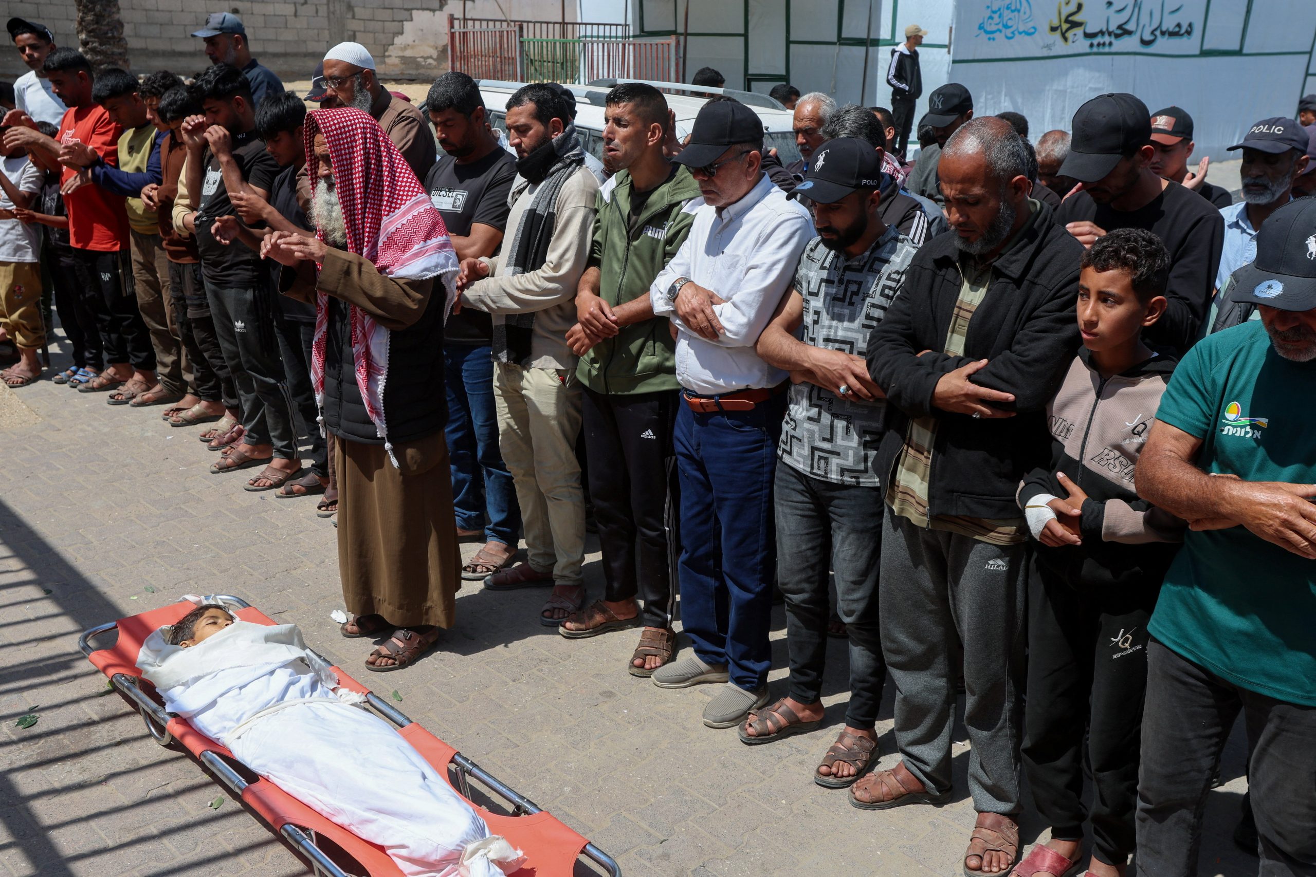 The boy, identified as Adel Al-Najjar, was killed when an Israeli aircraft targeted Khan Younis. Photos show Palestinians mourning him during a funeral outside the Nasser Hospital.